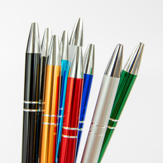 Su Camaloon trovi tutte penne con inchiostro blu e con il meccanismo a click. Le penne sono di tantissimi colori diversi, troverai certamente quella che meglio si abbina al tuo brand! I modelli standard sono in plastica, con stampa full color e con personalizzazione su corpo o clip della penna. L’ordine minimo è di 25 pezzi per la maggior parte delle penne e di 50 per una sola tipologia. Il modello premium è in metallo e viene personalizzato con incisione laser. Questa penna è molto elegante e morbida al tatto, è disponibile nei colori grigio, nero e blu.