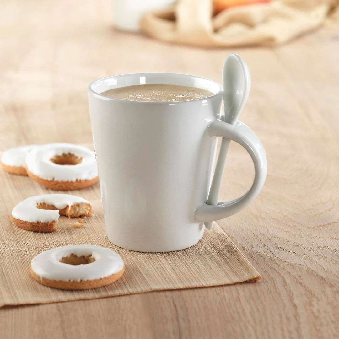 La tazza in gres con cucchiaino è perfetta per caffetterie, uffici e regali aziendali personalizzati. Personalizza questa tazza da 300 ml con il logo della tua azienda e sfrutta il suo design completo per far risaltare il tuo brand.